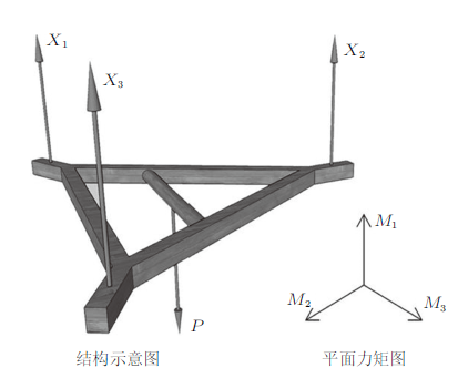 将结构改造为空间受力体系,如图14所示,结构杆件为布置在水平平面中的三角支架,而载荷位于面外,竖直方向。其中,$M_i$为支反力$X_i$在水桶重力$P$处产生的弯矩($i=1,2,3$)。