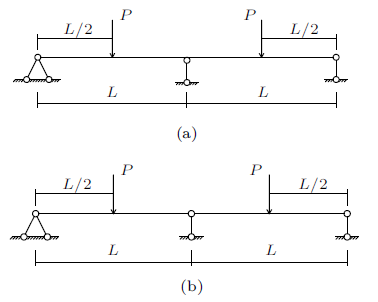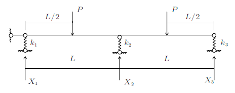 将内侧的两个水桶重量设为$P_{1} $,两端两个水桶重量设为$P_{2}$。解一次超静定结构,利用力法方程的变形协调条件可算得中间支座支反力为