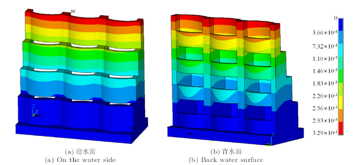 (2) 背水面墩墙下侧拉应力较大,迎水面各个阶梯连接处压应力较大。为使结构更加安全,可在结构背水面墩墙下侧接近外表面处适量增加钢筋,在迎水面各个阶梯连接处适当增加混凝土填料,以减轻墩墙截面变化处的应力集中。