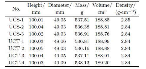 本试验试样取自湖南常德临澧县石膏矿矿区,对一整块原岩钻芯取样,以减小试样的离散性,打磨加工成表面光滑的50 mm,$\times$,100 mm标准试样,对加工好的岩样进行编号,并测定其基本的物理参数如表1 所示,蠕变试验准备如图1 所示。