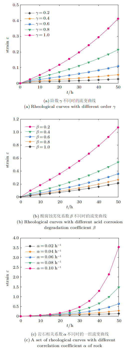 即式(6)为考虑酸腐蚀的变系数黏壶描述的流变。将$\sigma =38.4$ MPa,$\eta^{\gamma }=8$ GPa$\cdot$h,$\alpha =0.02$ h$^{-1}$,$\beta=1$,代入式(6)中,可得阶数$\gamma$不同时的流变曲线,如图6 (a);将$\gamma=0.8$代入式(6)中,其他参数不变,可得酸腐蚀劣化系数$\beta$不同时的一组流变曲线,如图6 (b);将$\beta =0.8$,$\gamma =0.6$代入式(6)中,其他参数不变,可得到岩石相关系数$\alpha$不同时的一组流变曲线,如图6 (c),由此可见,考虑酸腐蚀的变系数黏壶元件能够较好地反应化学腐蚀影响下的加速流变过程。