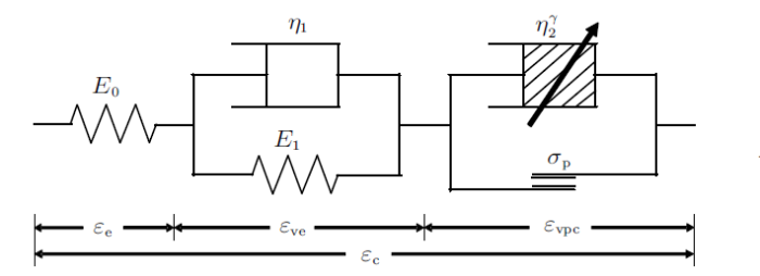 (10) $\varepsilon_{\rm ve} =\frac{\sigma }{{E}_{1} }\left( {1-{\rm e}^{-\dfrac{{E}_{1} }{\eta_{1} } t }} \right)$